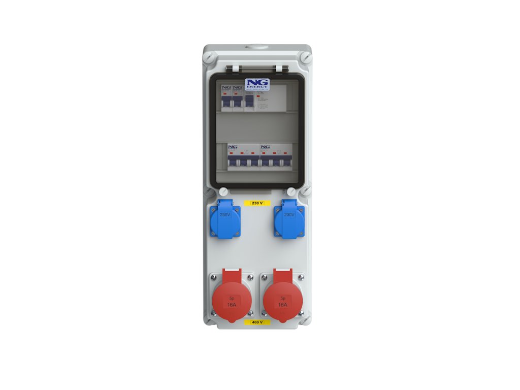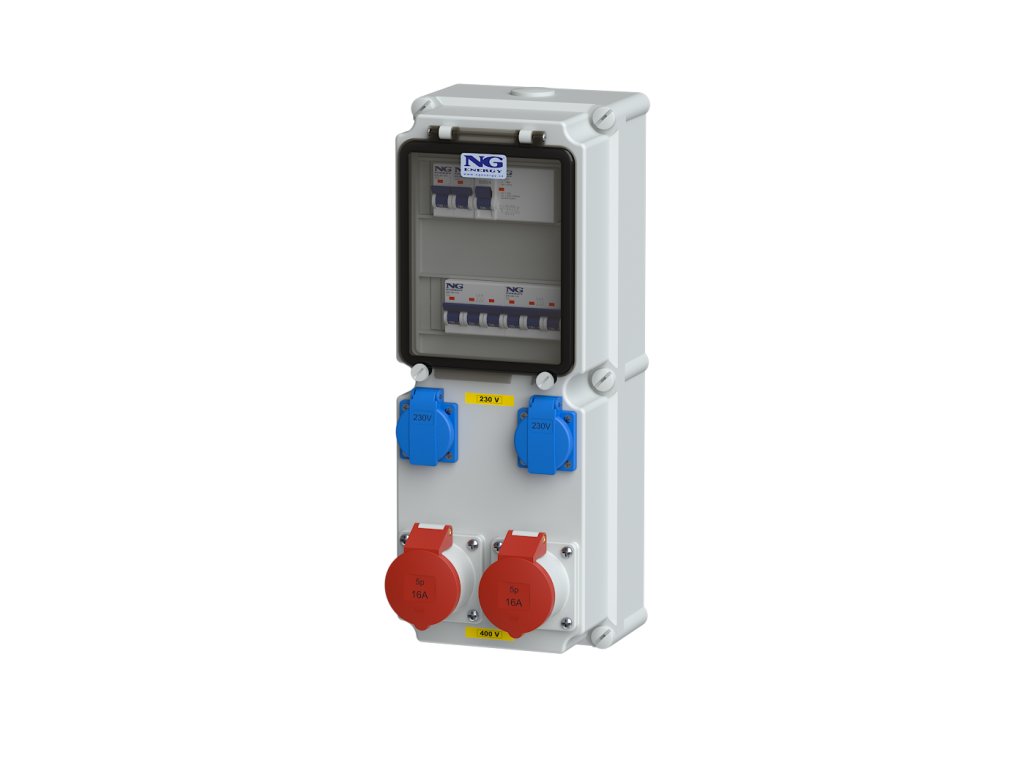 Zásuvky: 2x 16A/400V/5p, 2x 230V s ochr. kolíkem (česká), Jištění: 2x 16A/1P/B 10 kA, 2x 16A/3P/C 10 kA, Proudový chránič: 1x 40A/4P/30mA 10kA, V souladu s normou: ČSN EN 61439-3, Stupeň ochrany krytem: IP44, Jmenovitý proud: 40A, Jmenovité napětí: 400V, Teplotní rozsah použití: -25°C +40°C, Provedení: Nástěnné, Použití: Nástěnné, Pouzdro typ: BALS 6129, Materiál pouzdra: Polykarbonát, Materiál okénka: Polykarbonát, Počet okének: 1, Počet modulů pro přístroje: 16 (2x8) modulů, Barva pouzdra: šedá, Vývodka: 1x MV-32 IP68 (předvrtaný otvor uzavřen záslepkou, vývodka součást balení), Logistické údaje: EAN: 8595169535699, Hmotnost: 4,37 kg, Rozměry použitého pouzdra: 460x180x171. Standardní řada zásuvkových kombinací v polykarbonátových pouzdrech, určená i pro náročné prostředí dílen a staveb. Výběr pouzder nabízí dostatečnou variabilitu i pro náročnější sestavy. Lze vytvářet i přenosné varianty s madlem, s přívodkou či přívodním kabelem. Stejně jako v jiných řadách NG ENERGY je i zde součástí bezpečné a přehledné instalace dvojitá smyčkovací svorkovnice (s výjimkou ekonomických variant). UV-odolný materiál, bezšroubové zásuvky Bals a snadné připojení i smyčkování tvoří základ vedoucí pozice na trhu běžných zásuvkových kombinací. KLÍČOVÉ VLASTNOSTI: pouzdro z vysoce kvalitního, nárazuvzdorného a UV stabilního polykarbonátu, odolné vůči stárnutí, extrémním teplotám, vysoká chemická odolnost, bezhalogenní, samozhášivé, uzamykatelné a plombovatelné kryty přístrojů, přehledné prodrátování, volitelně dvojitá připojovací svorkovnice, volitelně vnější zemnící bod, celkové krytí až IP65. Na základě vašich individuálních požadavků je možné vytvořit jakoukoliv konfiguraci!Doplňkové parametry